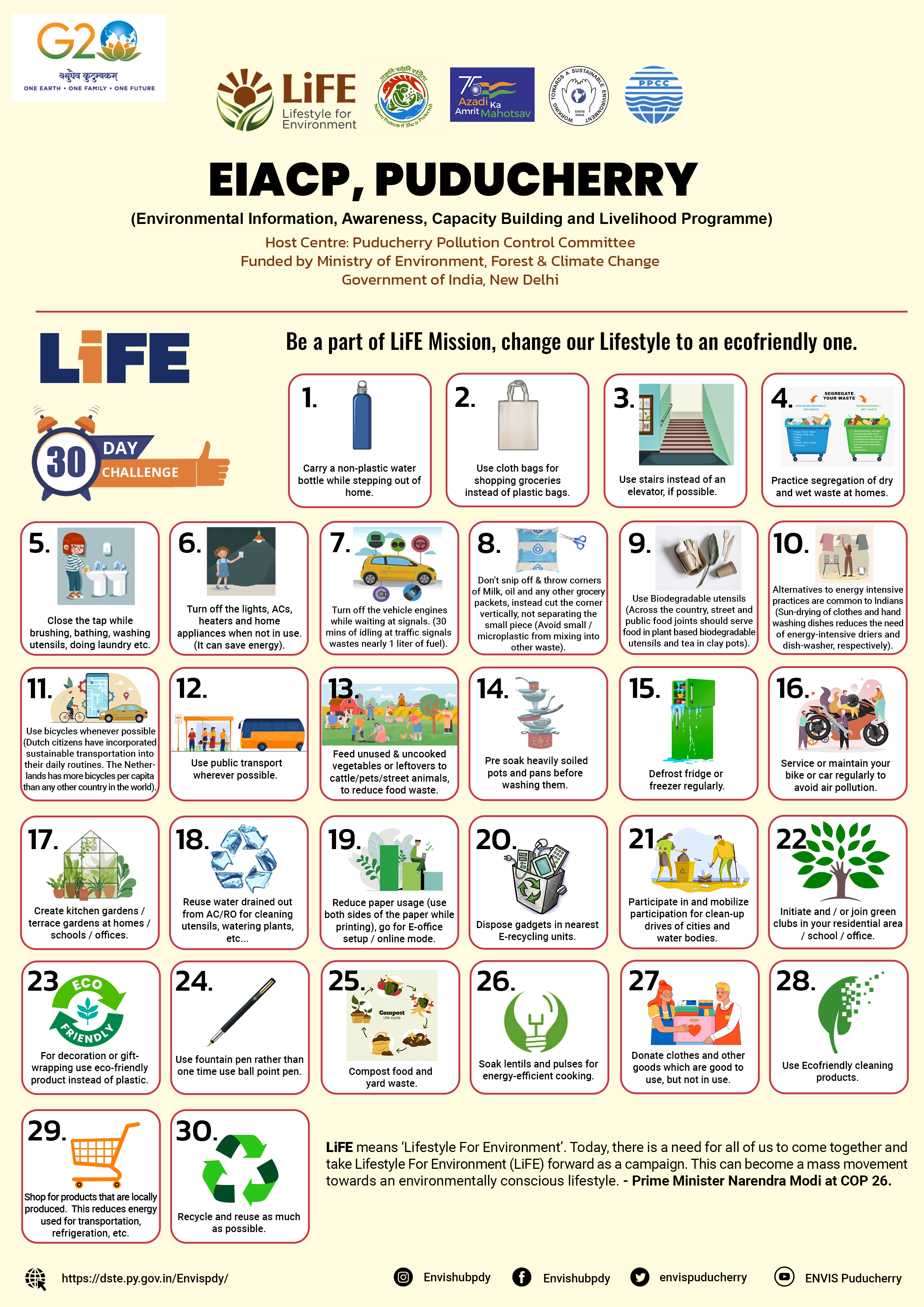 Changing our lifestyle, however, is not easy. Our habits are deeply ingrained in our daily lives and are continually reinforced through several elements of our environment. Translating our intention to do good for the environment is not always easy to translate into action. However, it is not impossible. By taking one action at a time and making one change daily, we can change our lifestyle and inculcate long-term environment-friendly habits. So EIACP Puducherry Created 30 Days Challenge for a step towards change in LiFE mission.